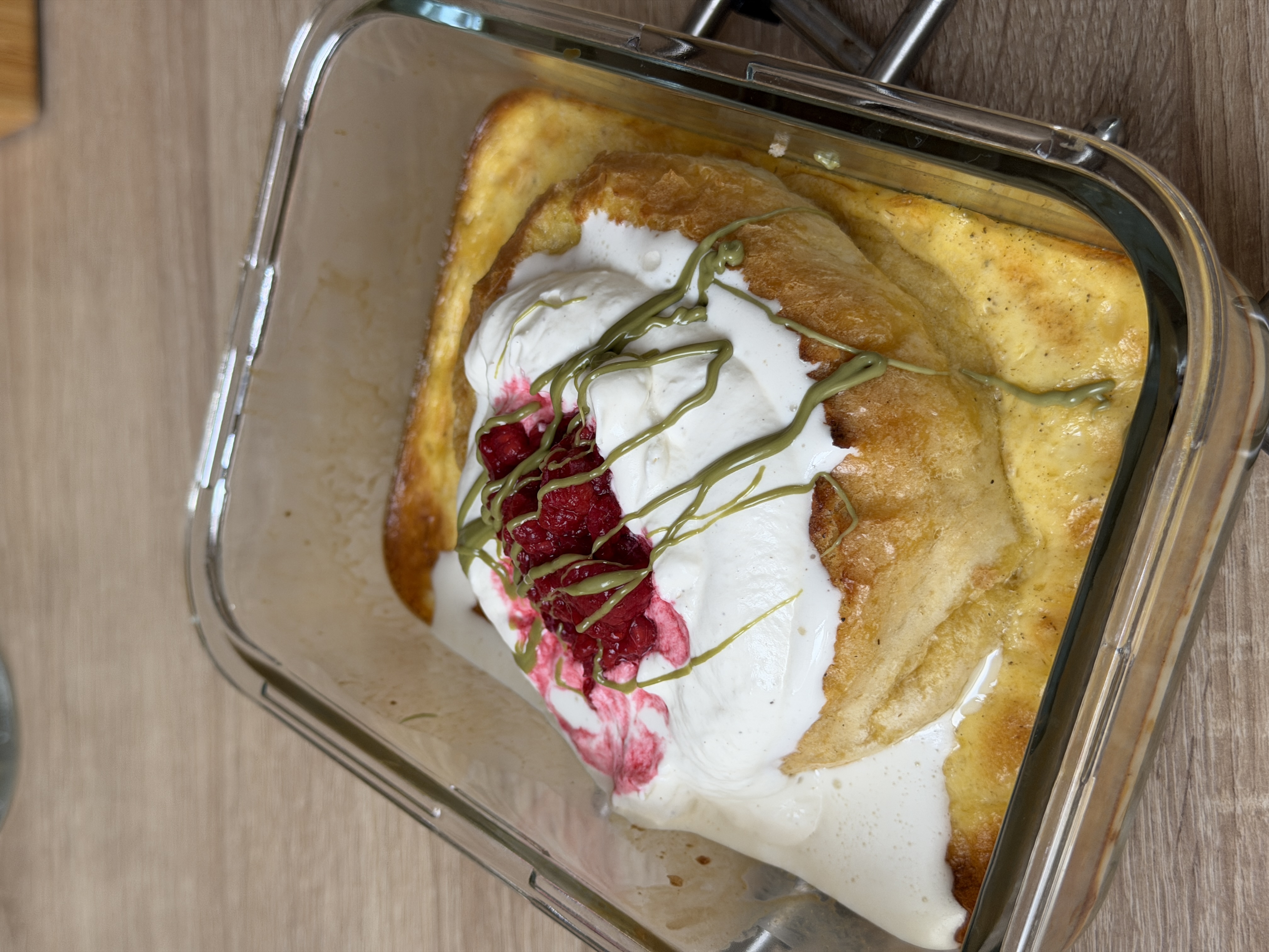 Pečico segrej na 175 stopinj. V posodici zmešaj jajce, smetano, mleko, vaniljev sladkor in sol. Odreži debelejši kos brioš kruha (približno 2,5 do 3 cm) in ga položi v mešanico. Pusti 1 do 2 minuti, obrni, pokrij z aluminijasto folijo in daj v pečico, segreto na 175 stopinj, za 25 minut. Vmes stepi smetano z vaniljo in nareži sadje. Odkrij folijo, zvišaj temperaturo na 200 stopinj in peci še 5 minut, da po vrhu lepo porjavi. Previdno vzemi pekač iz pečice, pusti, da se malo pohladi in nato serviraj kar v posodici. Dodaj 1 do 2 žlici smetane in sadje ter preliv po želji.